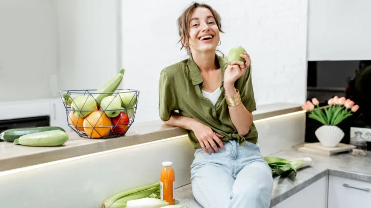 A woman enjoying nutritious vegetables and fruits that promote a dentist-approved smile.